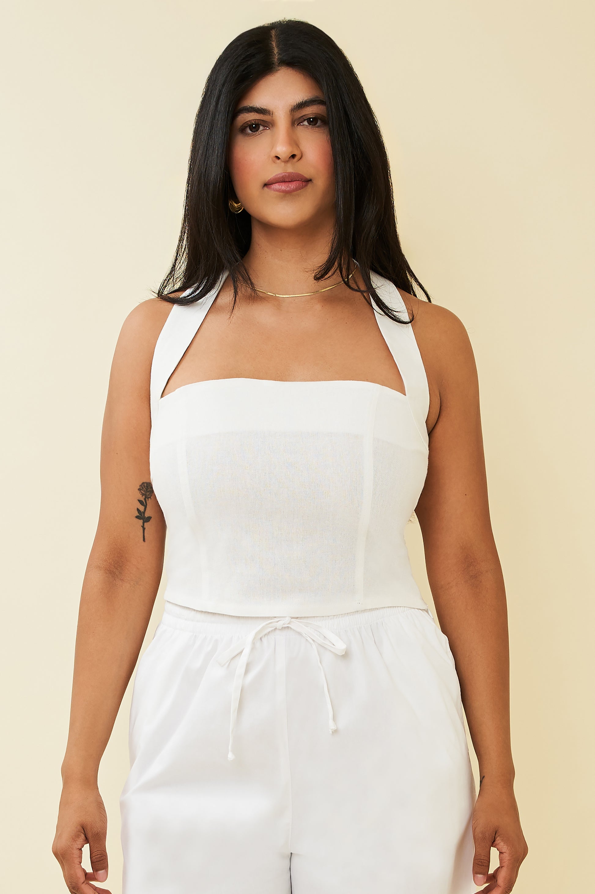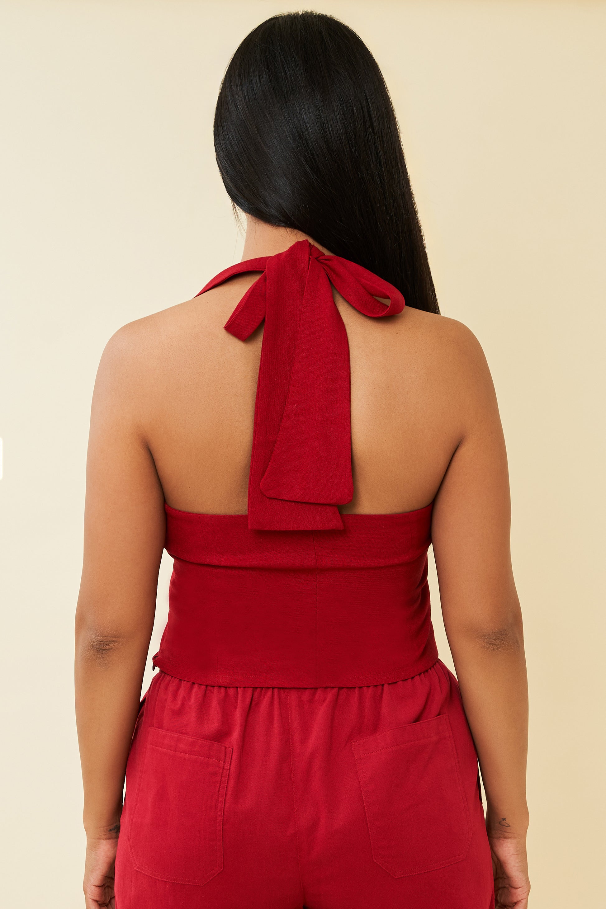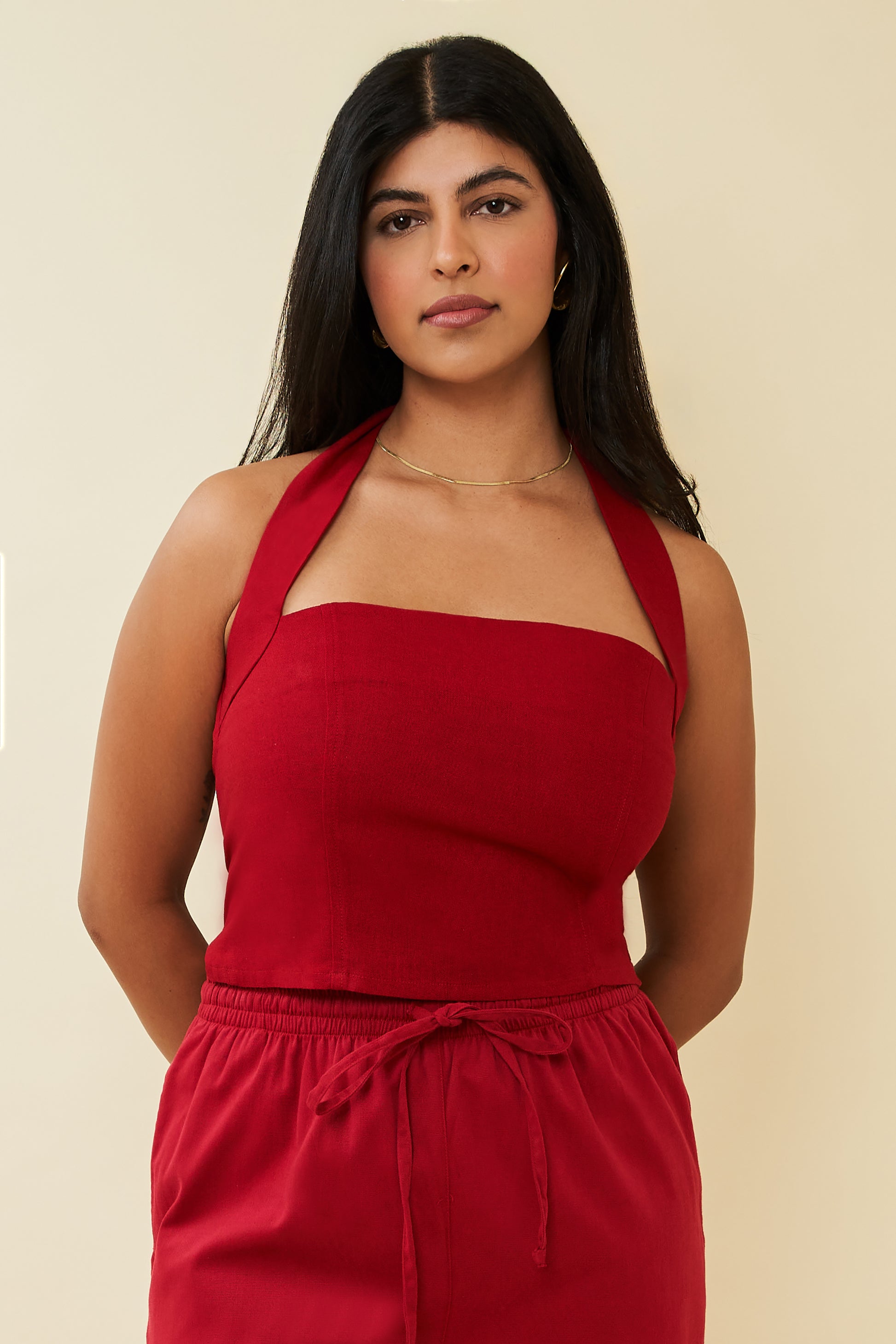 Description: The MARI HALTER - constructed in a midweight cotton linen, this fabric provides breathability for the summer heat. Shaped and structured to accentuate the waist. Adjustable halter straps. Zipper at side.